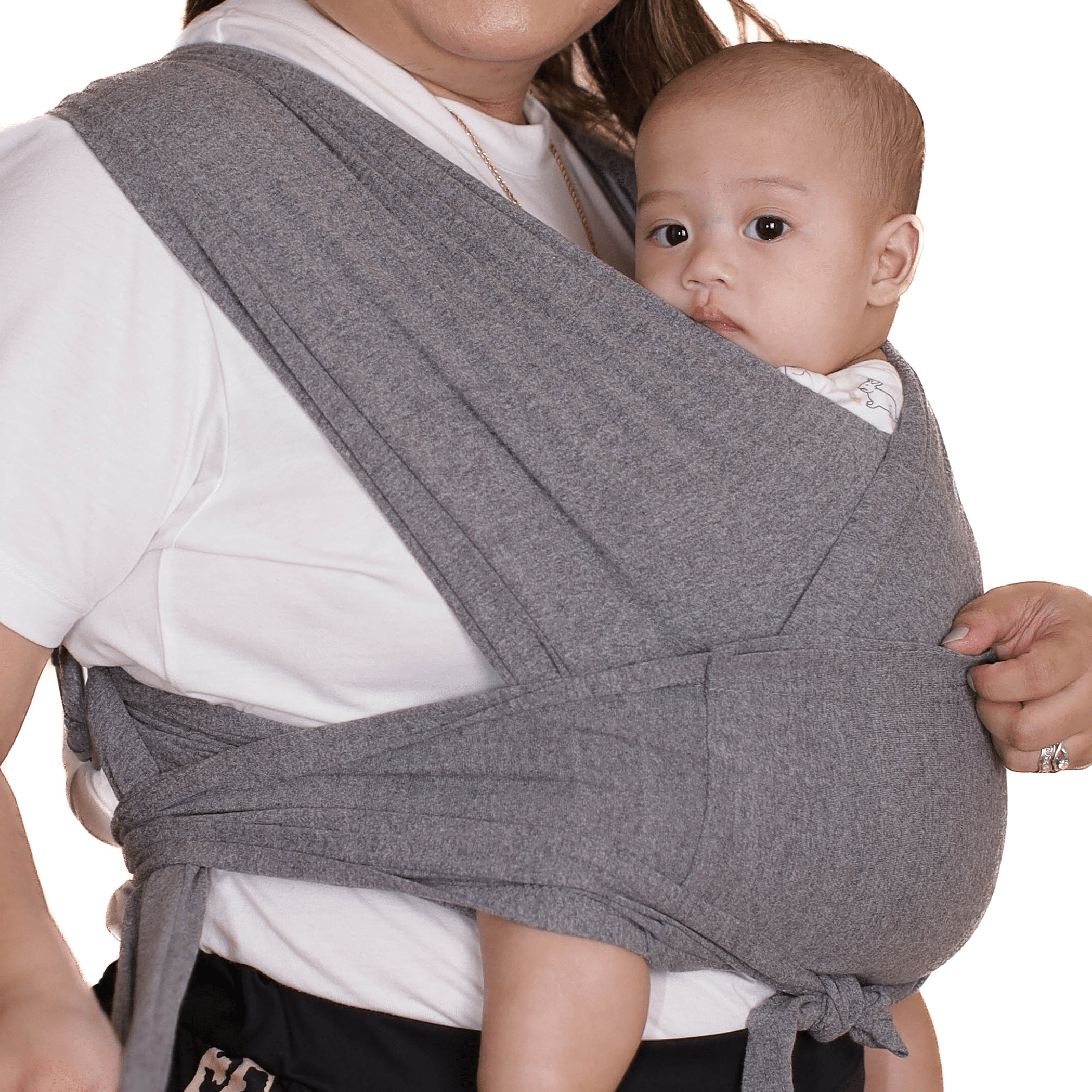 No complicated tying required. Simply adjust the wrap to fit your body and baby snugly.
